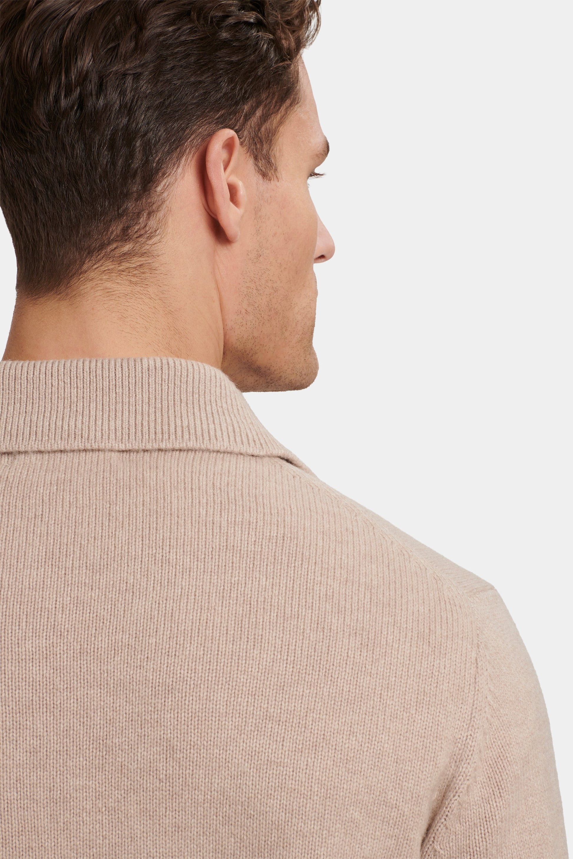 Confeccionado con una exclusiva mezcla de lana merino y cashmere, proporciona una calidez ligera sin añadir volumen, además de una textura extremadamente suave al tacto. Su corte ajustado ofrece una silueta estilizada, mientras que los puños y el dobladillo acanalados mantienen un acabado limpio y estructurado.